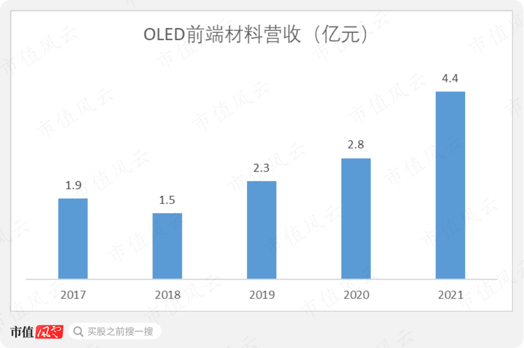 公司近5年来OLED材料业务增速较为可观,CAGR达到23.5%,在2021年业务营收达4.4亿元。