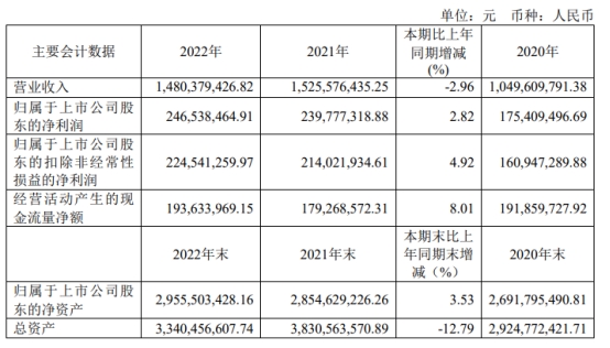 瑞联新材2022年年度报告显示,公司2022年营业收入为14.80亿元,同比下降2.96%;归属于上市公司股东的净利润为2.47亿元,同比增长2.82%;归属于上市公司股东的扣除非经常性损益的净利润为2.25亿元,同比增长4.92%;经营活动产生的现金流量净额为1.94亿元,同比增长8.01%。