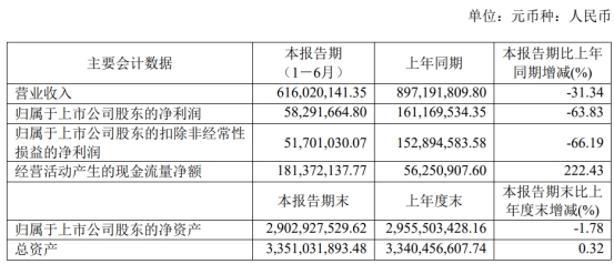 瑞联新材(688550.SH)2023年半年度报告显示,公司2023年上半年营业收入为6.16亿元,同比下降31.34%;归属于上市公司股东的净利润为5829.17万元,同比下降63.83%;归属于上市公司股东的扣除非经常性损益的净利润为5170.10万元,同比下降66.19%;经营活动产生的现金流量净额为1.81亿元,同比增加222.43%。