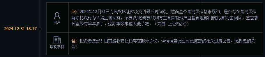 而在此后,也有投资者多次在上证e互动平台上问及公司股东和开投集团之间的股权转让进展情况,而瑞联新材也多次以本次协议转让尚需收购方主管国有资产监督管理部门的批准为理由进行回复。