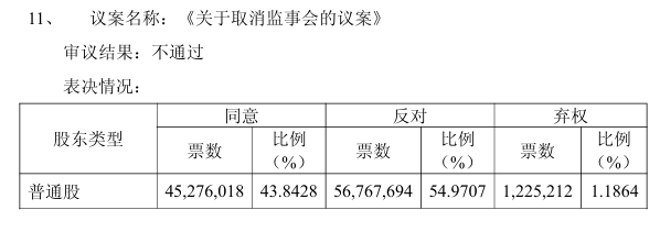 决议公告显示,大会共审议12项议案,涵盖年度报告、利润分配方案、董事选举等常规议程,而《关于取消监事会的议案》及配套章程修订案未获通过。同意票数占比43.8428%,反对票数占比为54.9707%。