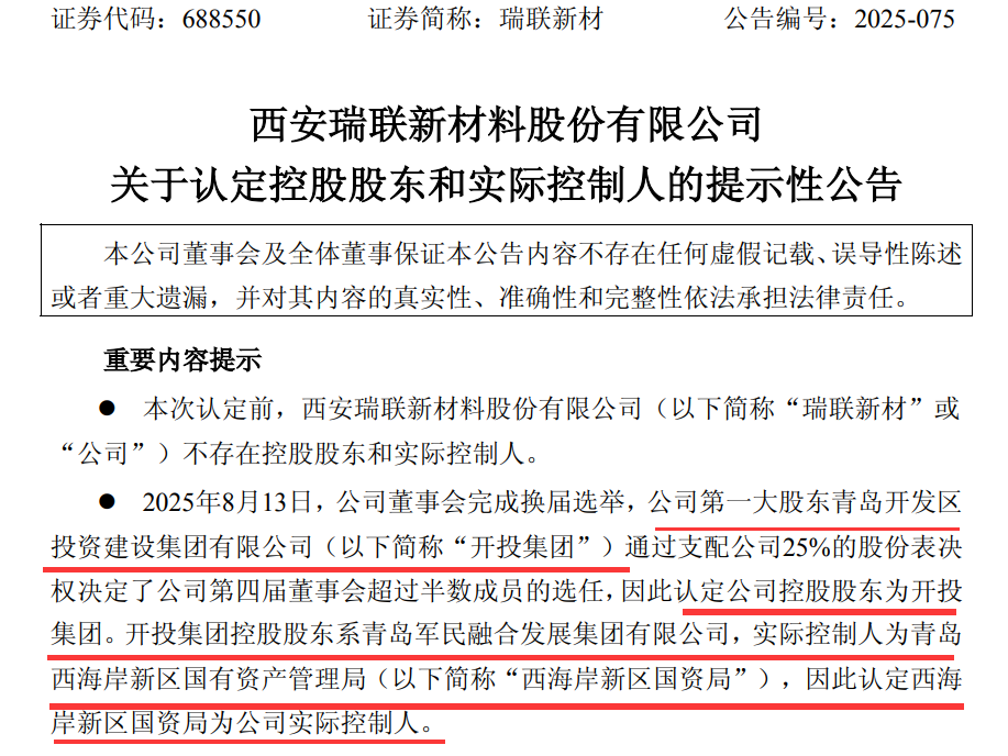 8月14日,西安瑞联新材料股份有限公司(以下简称:瑞联新材 688550.SH)发布公告称,公司第一大股东青岛开发区投资建设集团有限公司(以下简称:开投集团)通过支配公司25%的股份表决权决定了公司第四届董事会超过半数成员的选任,因此认定公司控股股东为开投集团。开投集团控股股东系青岛军民融合发展集团有限公司,实际控制人为青岛西海岸新区国有资产管理局,因此认定西海岸新区国资局为公司实际控制人。