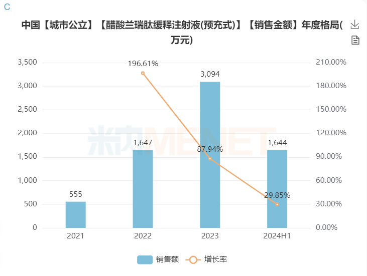 据米内网数据显示,2024年上半年中国城市公立医院终端醋酸兰瑞肽缓释注射液(预充式)的销售额约1644万元。目前该产品已纳入国家医保乙类,国内市场仅原研1家在售,市场前景可观。