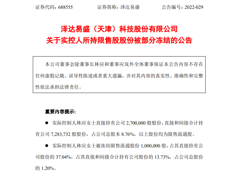 不过就在掌舵公司的高光时刻,系列风险也相伴而来。7月5日晚间,泽达易盛发布公告,公司于7月1日在收到中国证券登记结算有限责任公司下发的股东名册中发现,作为实际控制人的林应被冻结限售流通股份100万股,占其直接持有公司股份的37.04%,占其直接和间接合计持有公司股份的13.73%,占公司总股份的1.20%。