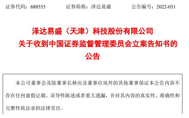 泽达易盛(天津)科技股份有限公司(泽达易盛,688555)公司董事长林应女士于2022年7月12日因涉嫌信息披露违法违规被中国证监会依法立案调查。被中国证券监督管理委员会出具了《立案告知书》(编号:证监立案字 03720220020 号)。林应女士