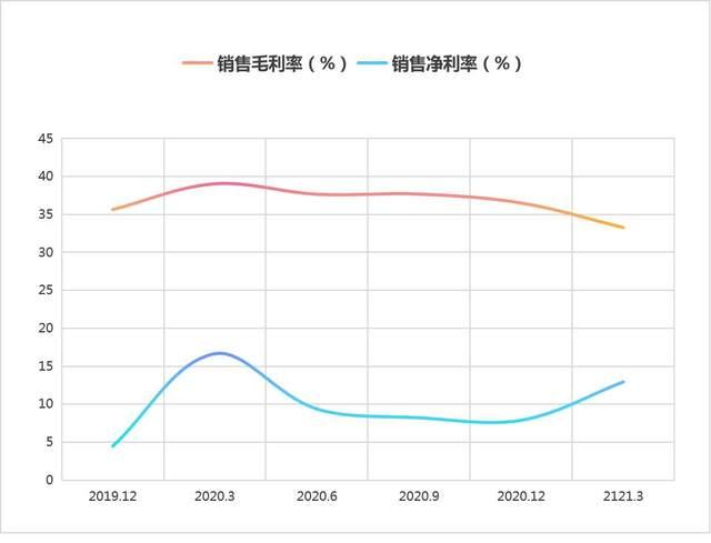 根据披露的2020年年报,从收入构成来看,高硬脆材料切割设备和高硬脆材料切割耗材为该高测股份营业收入的主要来源,实现营业收入6.88亿元,占公司主营业务收入的比重为 92.45%。其中,高硬脆材料切割设备实现营业收入4,57亿元,同比上期增长 19.11%,毛利率同比增加0.61%;由于市场竞争加剧,产品销售单价下降原因,高测股份高硬脆材料切割耗材收入2.3亿元,同比减少19.12%,毛利率为33.02%,同比增加0.56%。而轮胎检测及设备的收入为4149万,毛利率下降了4.66%。如下图所示,高测股份的毛利率在逐渐下滑,净利率与同期相比下来亦是不断下降,高测股份在同行业竞争优势在降低。