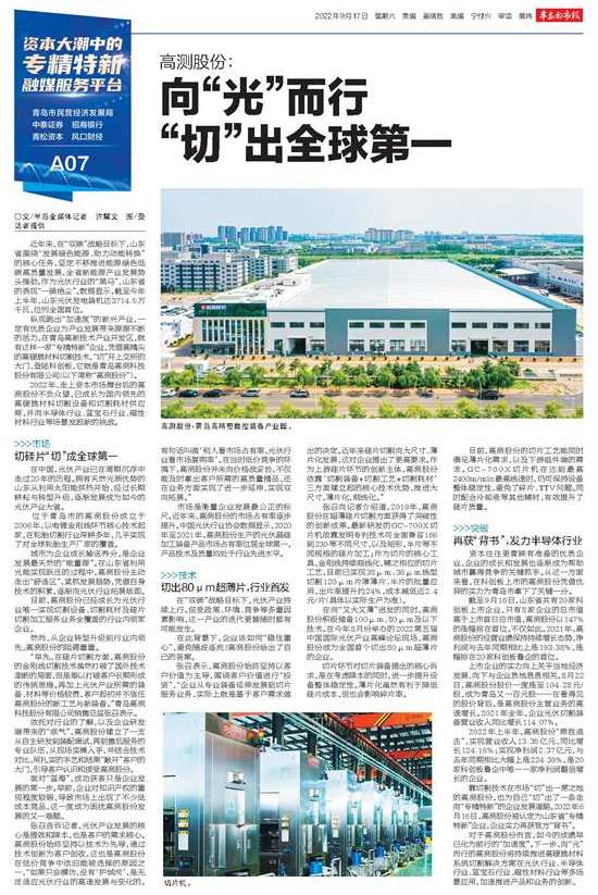 纵观跑出“加速度”的新兴产业,一定有优质企业为产业发展带来源源不断的活力。在青岛高新技术产业开发区,就有这样一家“专精特新”企业,凭借高精尖的高硬脆材料切割技术,“切”开上交所的大门,登陆科创板,它就是青岛高测科技股份有限公司(以下简称“高测股份”)。