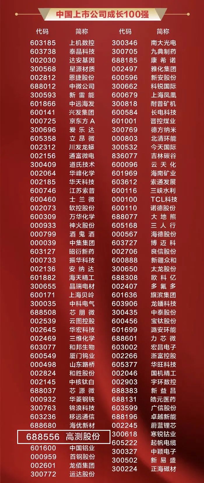 近日,第十六届中国上市公司价值评选获奖名单揭晓,高测股份荣获“中国上市公司成长100强”奖。