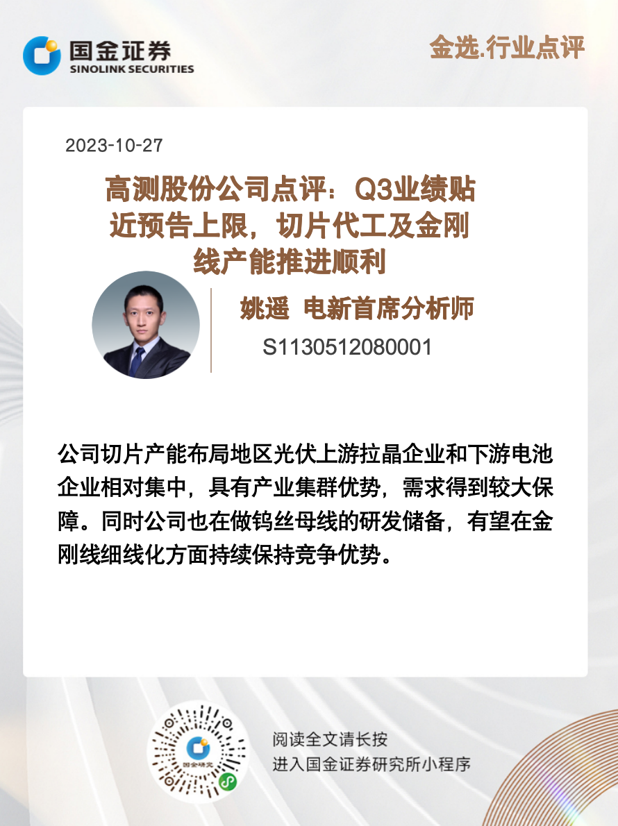 费用管控能力进一步提升,高质量盈利持续性确定性强:公司23Q3毛利率44.82%,同比+3.27pct,环比-5.58pct;净利率27.16%,同比+4.8pct,环比-2.91pct,主要系收入结构的变化及产业链价格波动的影响。根据wind数据,公司23前三季度销售/管理/研发费用率分别为2.1%/12.36%/6.15%,同比分别下降0.43pct/1.9pct/0.63pct。随着后续公司收入体量的进一步增长、费用管控能力的持续优化,期间费用率将会进一步降低,高质量盈利具有持续性。切片、金刚线产能有序推进,切片闭环优势持续兑现:截至23Q3,公司切片代工产能总规划为102GW,现有已投产产能26GW,建湖二期12GW项目处于全面爬产阶段,宜宾一期25GW项目正在建设中,预计2024年上半年释放产能,公司切片产能布局地区光伏上游拉晶企业和下游电池企业相对集中,具有产业集群优势,需求得到较大保障。金刚线方面,预计23年年底公司具备6000万公里年化产能,且细线化进展顺利。公司目前主流出货线径为32、34线,切片自用金刚线从30向25转变,大幅领先竞争对手。同时公司也在做钨丝母线的研发储备,有望在金刚线细线化方面持续保持竞争优势。