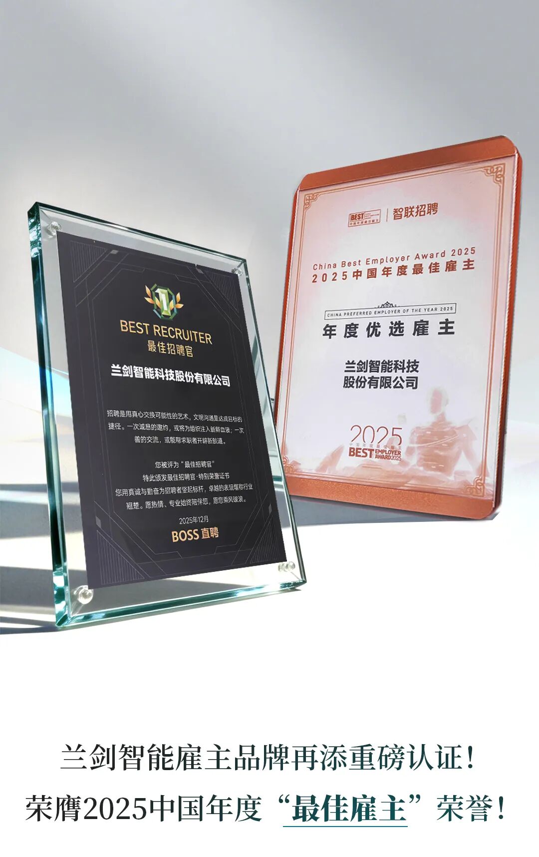 与此同时,斩获BOSS直聘“最佳招聘官”称号,两项荣誉印证了行业对兰剑智能人才战略及雇主品牌的高度认可。
