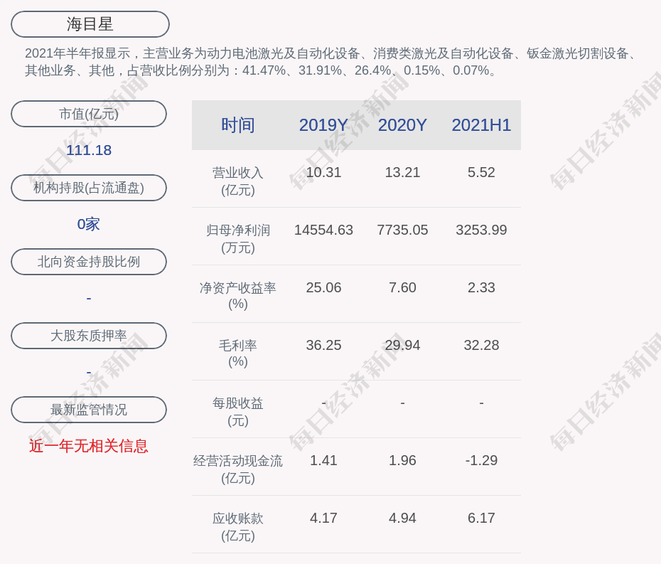 2021年半年报显示,海目星的主营业务为动力电池激光及自动化设备、消费类激光及自动化设备、钣金激光切割设备、其他业务、其他,占营收比例分别为:41.47%、31.91%、26.4%、0.15%、0.07%。