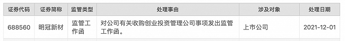 12月1日,上交所对明冠新材有关收购创业投资管理公司事项发出监管工作函。
