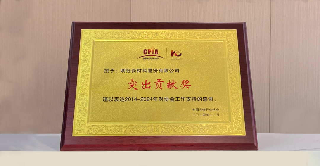 近日,我司荣获中国光伏行业协会颁发的“突出贡献奖”,以表彰我司在2014至2024年间为光伏行业发展所作出的杰出贡献。这一荣誉是对明冠新材过去十年来深耕光伏领域、推动技术进步和行业规范化发展的高度肯定。