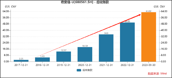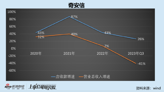 我们看两组数据,第一组数据公司应收款增长数据,奇安信的规模扩张背后是应收款显著增长。