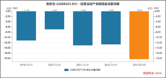 由于公司用应收款推高营收,因此公司的现金流表现较差,持续净流出。数据显示,公司近年经营活动净流出累计金额高达近62亿元。