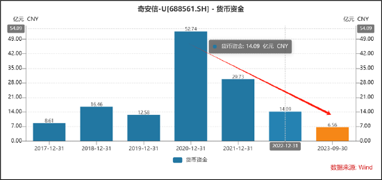 由于公司主业造血能力较差,公司通过IPO等渠道融资获得货币资金也被在快速消耗殆尽,2020年公司货币资金超50亿元,而去年三季报末,公司的货币资金仅剩6.56亿元。