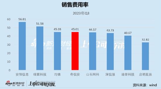 第二组数据,公司的销售费用等情况。截止2023年三季度,奇信安的销售费用为16.59亿元,占同期收入之比为45%。需要指出的是,奇信安的销售费用水平属于行业均值附近,但费率水平排名排在可比行业中前三名位置。