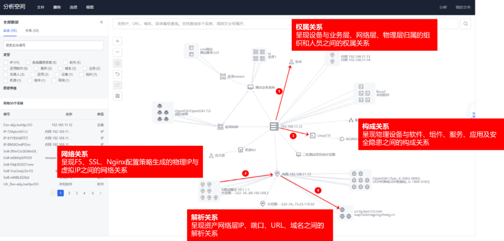 基于“拼图式”资产融合技术,将主动扫描、流量监听、人工维护的资产信息融合关联,碎片化信息相互补全,数据冲突自动消解,资产属性动态更新,自动构建时空动态资产地图。通过提升资产数据准确性和时效性,解决网络资产“盘不清”的问题。通过“实体关系”图谱,可视化呈现资产间的依赖关系,形成资产拓扑,厘清资产物理层、网络层、系统层、服务层、业务层关联关系。当发生安全风险时,可一键定位受害资产,减少查询入口,缩短查询路径,解决问题受害资产“找不到”的问题。