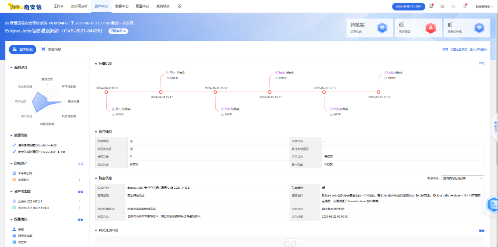 想象这样一些场景:凌晨3点,新部署的云数据库悄然开放3306端口;中午12点,离职员工程序员的测试API仍未关闭;下午4点,子公司并购的旧系统检测出Log4j漏洞……这些看似零散、隐蔽的风险,在奇安信CAASM系统中都无法遁形。系统会自动对这些碎片化风险进行关联、告警,并生成处置工单,7×24小时不间断构建动态防御基座,全方位守护企业网络安全。