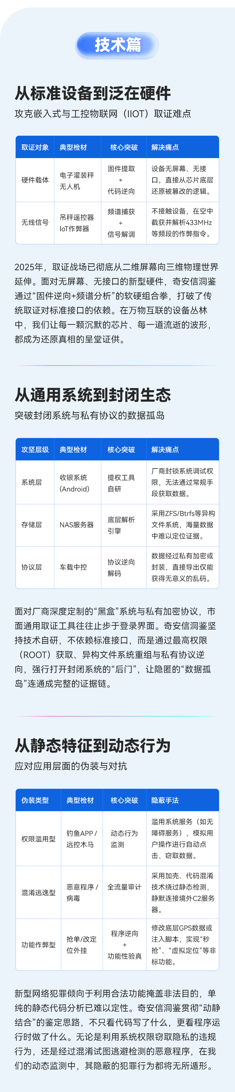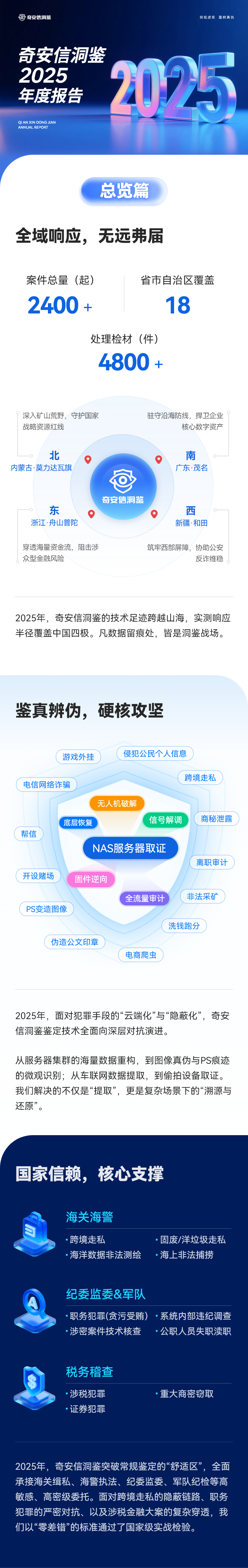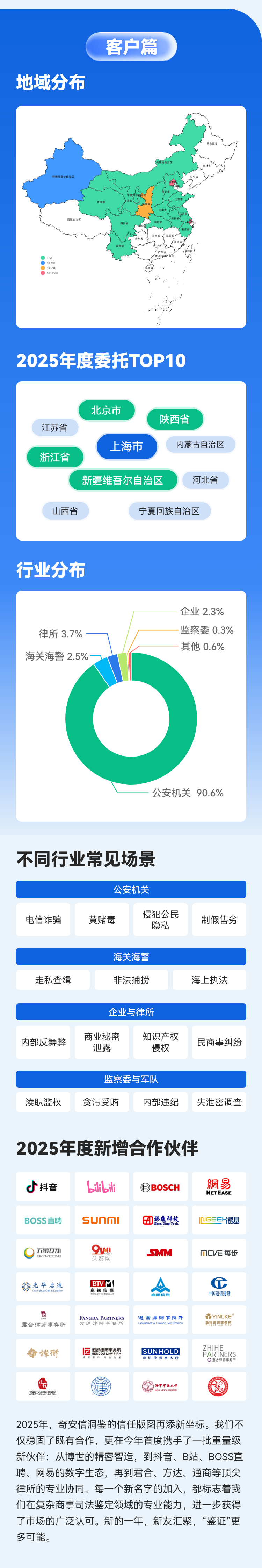 奇安信集团旗下有北京、上海、西安三家司法鉴定所:北京网神洞鉴科技有限公司司法鉴定所、上海盘石洞鉴科技有限公司司法鉴定所与陕西西安洞鉴云侦声像资料司法鉴定所。其中,上海所是上海第一家通过 CNAS 认证认可的民营计算机类司法鉴定机构。三所均通过了CMA资质认定,是目前国内少数能够通过自主研发软件进行取证与分析的电子数据司法鉴定机构,具有独立的实验室场所,其中包括:案件受理区、数据恢复区、手机取证区、计算机取证区、屏蔽室、无尘工作间和物证室,并配备多种国内外先进的技术检验及辅助设备。经过多年的时间积累和发展,现拥有一批胜任鉴定工作的专业技术人员,以专业的技能和丰富的经验,来开展声像资料和电子数据司法鉴定工作。开展的鉴定服务范围包括:声像资料鉴定、电子数据司法鉴定、计算机证据固定和获取、手机终端取证与分析、数据恢复、密码破解以及涉及电子设备的民事调查等。