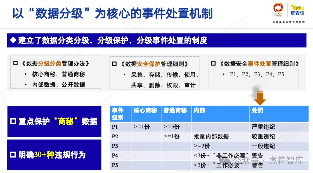 制度体系以《数据分级分类管理办法》为轴心,并与人力制度勾连,关联《员工手册》。例如,同样是"下载3份文件",内部数据仅需警告,普通商秘记过,核心商秘直接开除。