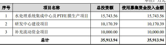 力源科技最终募集资金净额与原计划少1.61亿元(16073.42万元)。力源科技于2021年2月25日披露的招股说明书显示,公司拟募集资3.59亿元,分别用于水处理系统集成中心及PTFE膜生产项目、研发中心建设项目、补充流动资金项目。