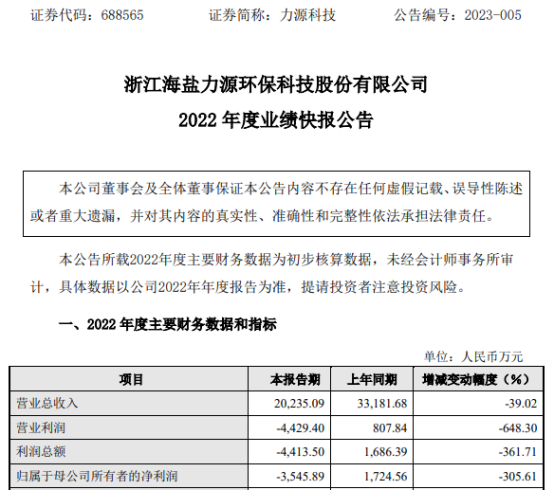 挖贝网2月28日,力源科技(688565)发布2022年度业绩快报,公告显示,2022年度营业总收入为20,235.09万元,比上年同期下滑39.02%;归属于母公司股东的净利润为-3,545.89万元,较上年同期由盈转亏。