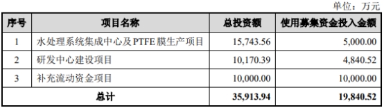 力源科技首次公开发行募集资金总额为25,118.25万元,募集资金净额为19,840.52万元,公司2021年5月10日披露的招股书显示,公司募集资金计划用于水处理系统集成中心及PTFE膜生产项目、研发中心建设项目、补充流动资金项目。