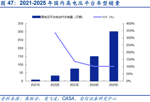 细分来看,安信证券预计2021-2025年,国内高电压平台车型销量分别约为7、31、73、148、300万辆。2022年至2025年,高电压平台车辆同比增速分别为335.4%、137.7%、101.8%、102.3%。