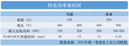 与此同时,与800V高压车型适配的高压大功率充电桩的数量也将联动增长。2021年业内预计将铺设3000+超快充电桩,到2023年数量扩充至10000+。再加上存量桩的升级,未来将有更大功率的充电桩出现在路端。