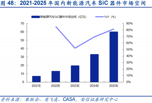 其中最典型的莫过于由于达到材料极限,原本在新能源汽车产业中如火如荼的硅基IGBT芯片,被具备耐高压、耐高温、高频等优势的碳化硅取而代之。碳化硅功率器件不仅在耐压和损耗水平上都能满足800V电压平台的需求,还具备进一步拓展至1200V电压平台的潜力。据安信证券测算,2025年国内新能源汽车碳化硅功率器件的市场规模有望达到60亿元。
