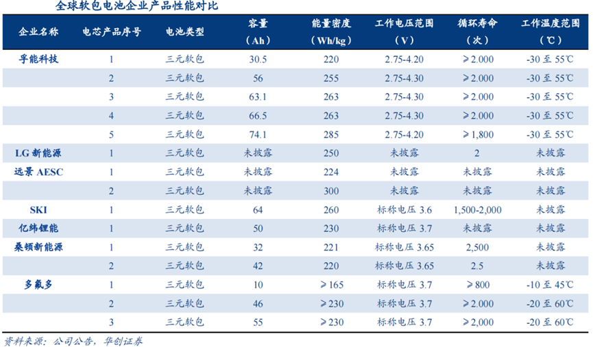 目前,国内绝大多数能量密度突破300Wh/kg大关的电池企业采用的都是软包电池。就拿孚能科技来说,当年打入戴姆勒供应链靠的产品便是能量密度为285Kwh/kg的软包电池。而彼时,其它供应商技术普遍在160-250Kwh左右。