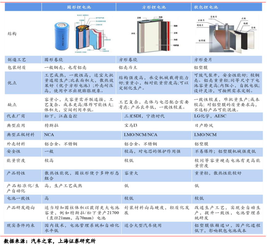 从包装材料来看,锂电池主要分为圆柱、方形、软包三种电池技术。