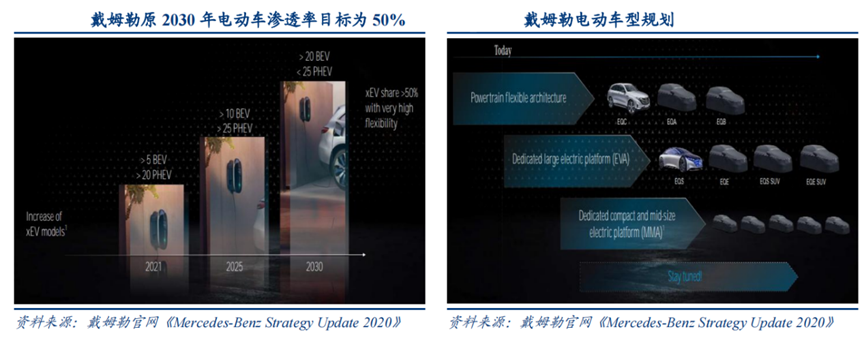 在此背景下,大众、雷诺、戴姆勒等均提出其电动汽车战略发展目标及规划。戴姆勒上调其2025和2030年电气化战略目标规划,计划在2025年实现电动车50%的渗透率,2030年实现纯电动车100%的渗透率。