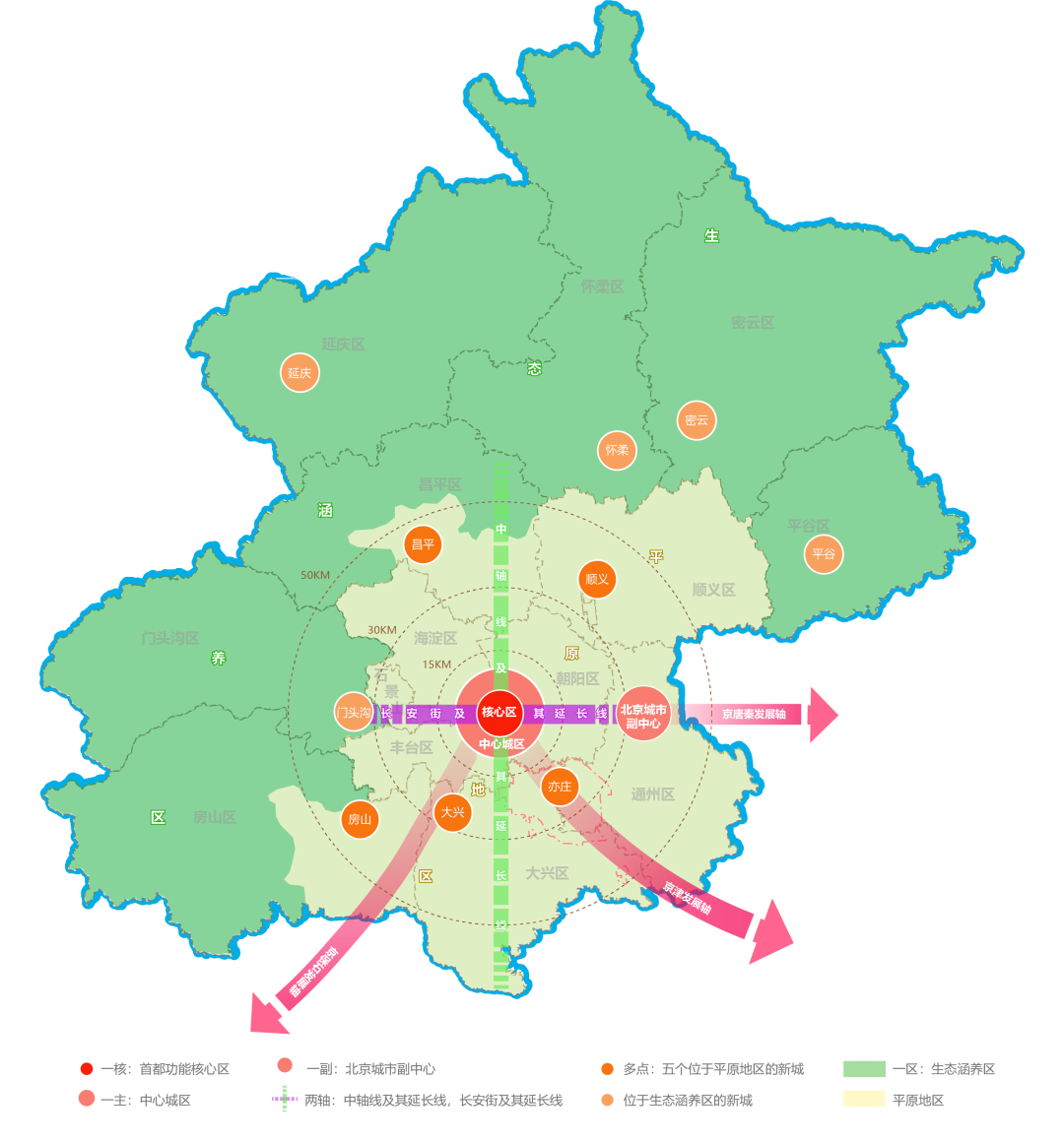 总体布局部分,以新版北京城市总体规划、国务院关于《深化北京市新一轮服务业扩大开放综合试点建设国家服务业扩大开放综合示范区工作方案》的批复、《北京市“十四五”时期高精尖产业发展规划》等为依据,形成城市总体规划图、现代服务业布局图和先进制造业布局图3幅。