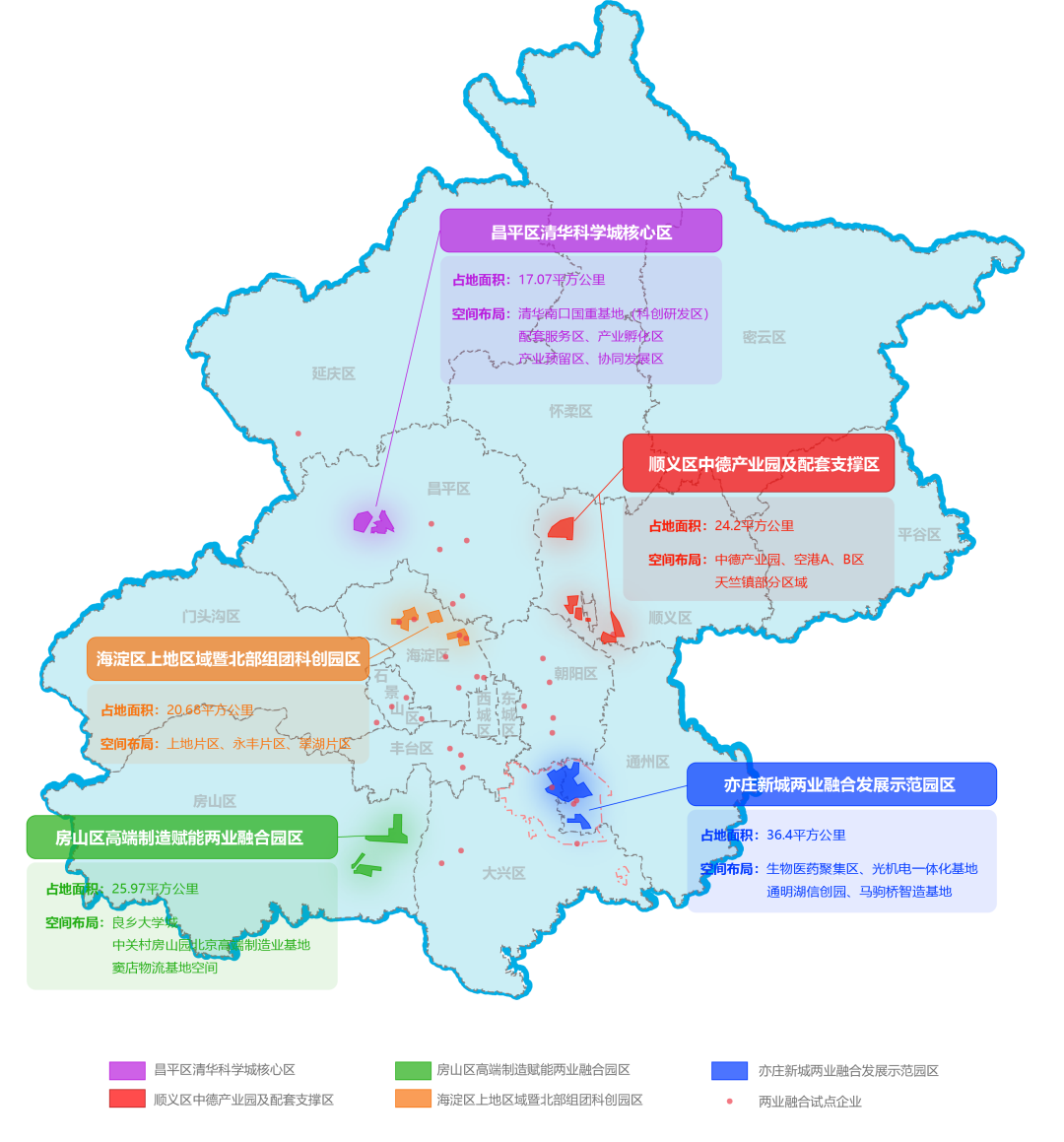 区域布局部分,以16个区和经开区的分区国土空间规划、产业发展规划和专项行动计划为依据,覆盖26个重点产业园区,形成北京城市副中心、三城一区、平原新城、城南地区、京西地区、两业融合示范园区及试点企业、中关村一区十六园发展组团、中关村高品质科技园和特色产业园区、京津冀协同创新体共9幅空间布局图。