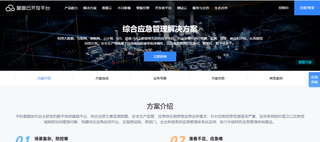 综合应急管理解决方案利用大数据、互联网、物联网、云计算、GIS、遥感、人工智能等先进的技术手段,对应急事件进行预测、监测、预警、响应和评估,从而提高自然灾害、安全生产等场景下应急响应的效率和准确性,以及应急管理的信息化、智能化、数字化水平。