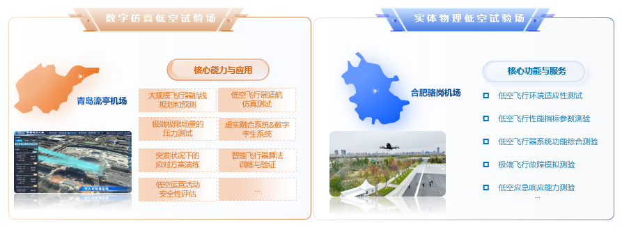 两类试验场:青岛全数字化仿真试验场与合肥物理飞行验证场双轨并行,覆盖低空飞行模拟、预测评估全链条,加速实现技术迭代与场景验证。