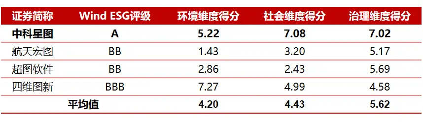 在与航天宏图、超图软件、四维图新等可比同行对比中,中科星图的评级依旧处于优势地位。不过,Wind数据显示,公司在环境维度得分方面相对较弱。