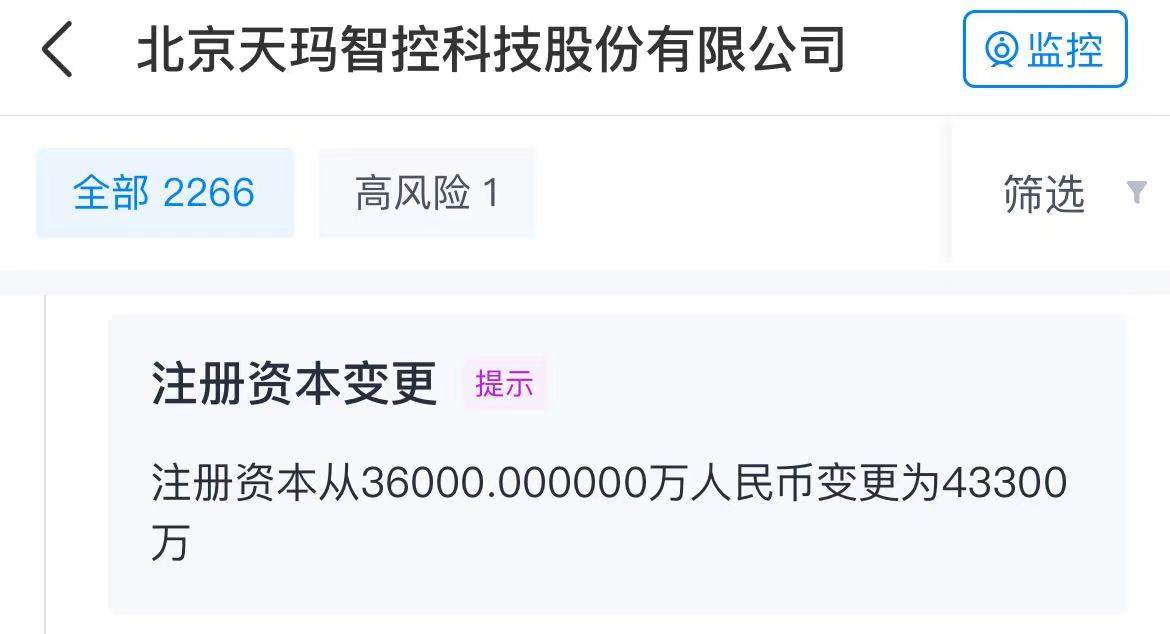 8月23日,北京天玛智控科技股份有限公司(以下简称“天玛智控”)注册资本发生变更,从3.6亿元增加至4.33亿元,增幅20.28%。