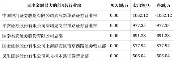 中国银河证券股份有限公司武汉新华路证券营业部、平安证券股份有限公司深圳龙岗吉祥路证券营业部、国泰君安证券股份有限公司总部分别卖出1062.12万元、977.35万元、691.28万元。