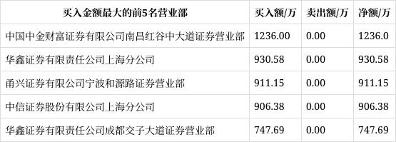 其中,中国中金财富证券有限公司南昌红谷中大道证券营业部、华鑫证券有限责任公司上海分公司、甬兴证券有限公司宁波和源路证券营业部分别买入1236.00万元、930.58万元、911.15万元。