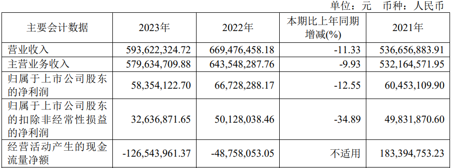 2023年,信宇人实现营业收入5.94亿元,同比下降11.33%;归属于上市公司股东的净利润5,835.41万元,同比下降12.55%;归属于上市公司股东的扣非净利润3,263.69万元,同比下降34.89%;经营活动产生的现金流量净额为-1.27亿元,上年同期为-4,875.81万元。