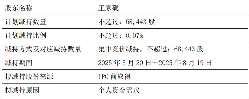 信宇人(688573.SH)昨日披露公告,公司董事王家砚计划自公告披露之日起15个交易日之后的3个月内(即2025年5月20日至2025年8月19日),通过集中竞价方式减持所持有的公司股份,王家砚拟减持股份数量不超过68,443股,占公司总股本的比例不超过0.07%,减持价格将根据市场价格确定,但不低于发行价格。