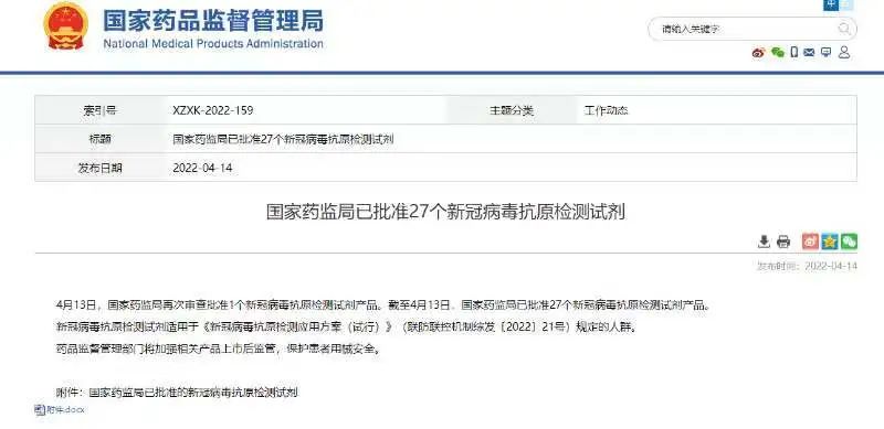 据国家药监局官网消息,4月13日,国家药监局再次审查批准1个新冠病毒抗原检测试剂产品。截至4月13日,国家药监局已批准27个新冠病毒抗原检测试剂产品。