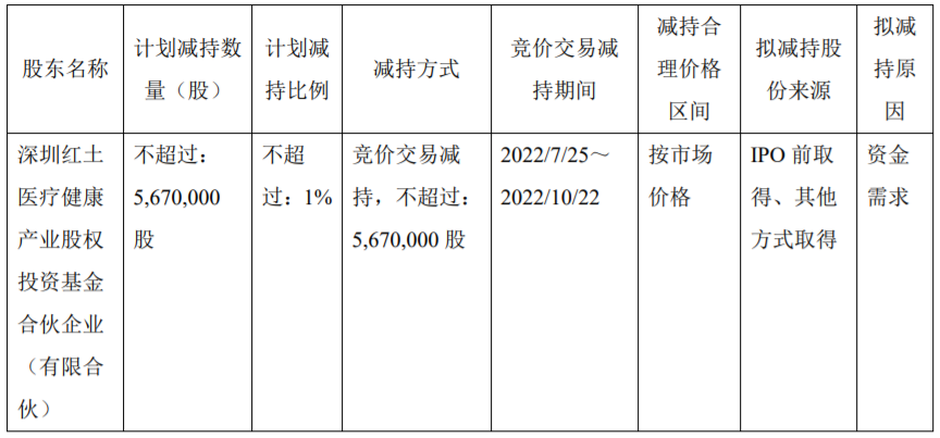 亚辉龙6月30日发布公告,因自身资金需求,公司股东深圳红土医疗健康产业股权投资基金合伙企业(以下简称“红土医疗”)计划通过集中竞价方式减持其持有的公司股份,合计数量不超过567万股,占公司股份比例不超过1%。减持期间为自本公告披露之日起15个交易日后的90日内。