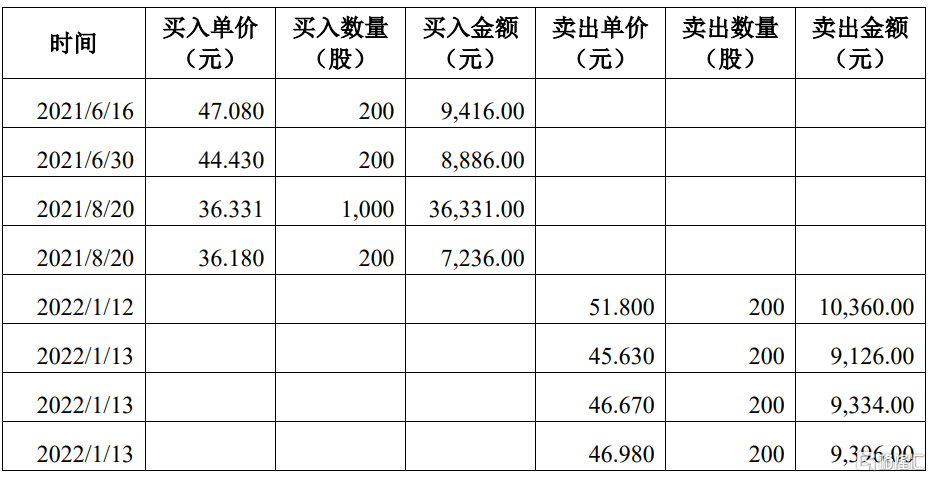 王慧翀自2021年11月4日起担任公司监事,根据《证券法》等相关规定,其母亲周桂芝在买入后六个月内卖出、及在卖出后六个月内买入公司股票的行为构成短线交易,短线交易涉及股数共800股,获利金额为9171.33元,周桂芝已主动将所获收益全数上交公司。