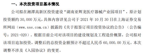 挖贝网7月20日,亚辉龙(688575)近日发布公告,公司拟在湘潭高新区投资建设“湖南亚辉龙医疗器械产业园项目”,原计划投资额约30,000万元。根据目前公司对该项目的建设规划及工程造价概算,公司拟对该项目追加投资,调整后的总投资金额预计不超过人民币60,000.00万元。本次调整不涉及《入园协议》的变更。