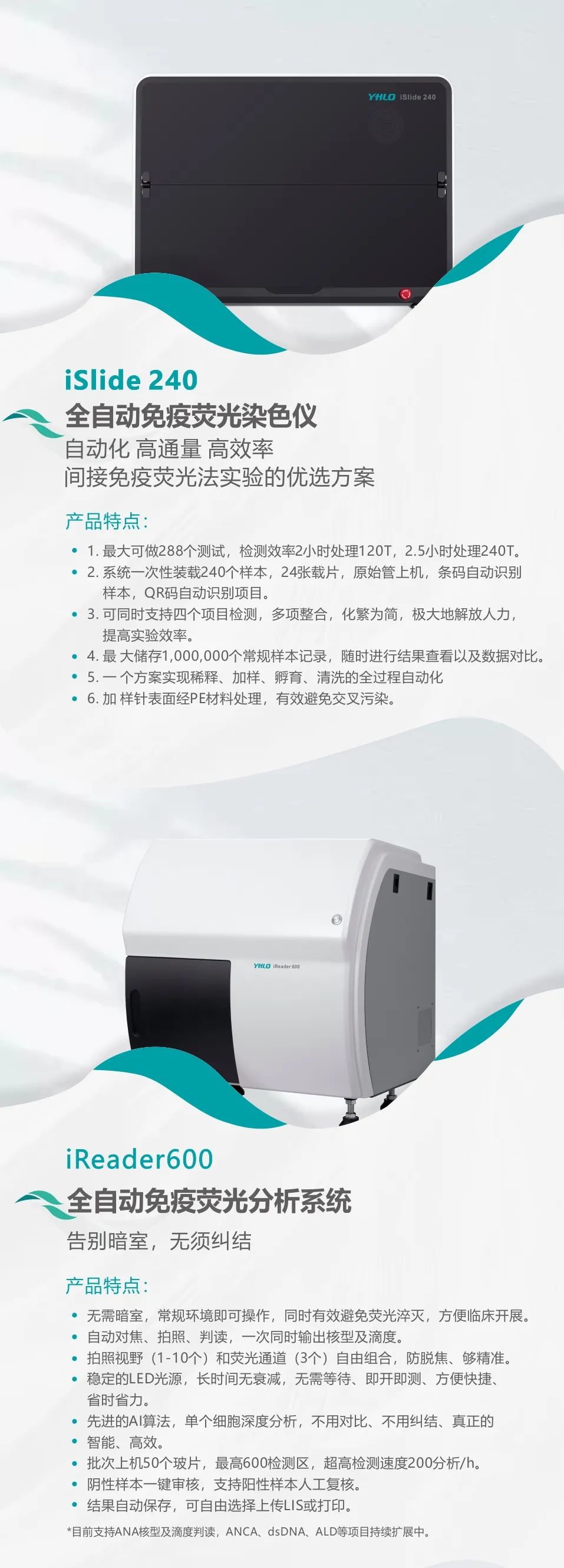 间接免疫荧光法是自身抗体检测在临床诊断中的标准方法,也是探索未知自身抗体的经典方法,大部分自身抗体首先是通过间接免疫荧光法发现的。全自动免疫荧光分析系统主要功能是支持间接免疫荧光法实验载片的结果判读。目前支持抗核抗体、抗dsDNA抗体、抗中性粒细胞胞浆抗体、自身免疫性肝病相关抗体的结果图像获取以及抗核抗体荧光模式的识别;未来可升级为病原体荧光载片的结果判读;未来可升级为病原体荧光载片的结果判读;其判读结果准确性:判读重复性≥90%;判读总符合率≥90%;全自动免疫荧光分析系统实现了间接免疫荧光实验的检测与分析高度自动化、标准化、规范化、信息化管理,具有实现检验流程完善、人为误差小以及提高检测分析质量、减少生物危害和人力成本等优点,适合于满足现代实验室高效科学管理。