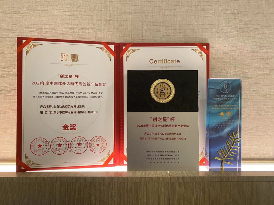 深圳市亚辉龙生物科技股份有限公司全自动免疫荧光分析系统荣获2021中国体外诊断年度优秀创新产品-仪器金奖、壳多糖酶3样蛋白1测定试剂盒(化学发光法)荣获2021中国体外诊断年度优秀创新产品-试剂金奖。此外,亚辉龙继获得2020年度协会工作突出贡献奖后再次荣获2021年度协会工作突出贡献奖。